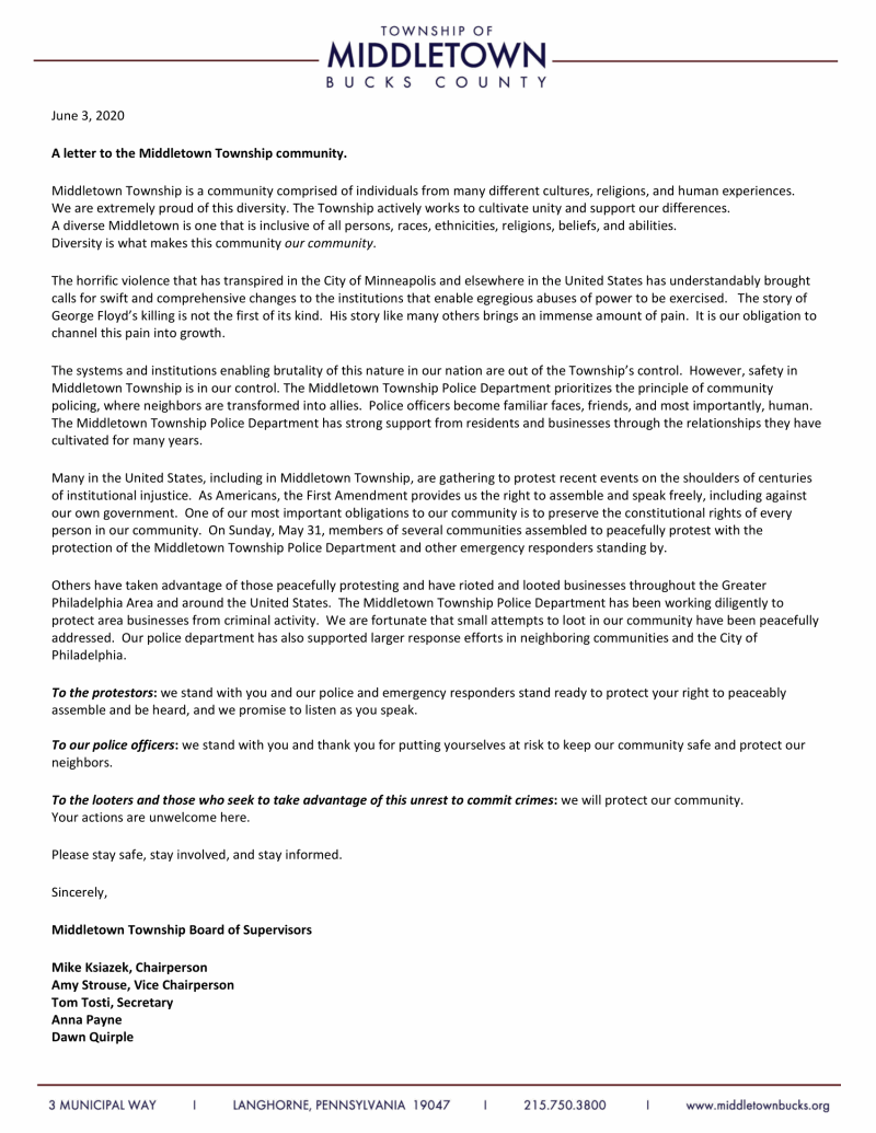 A letter to the Middletown Township community.